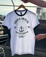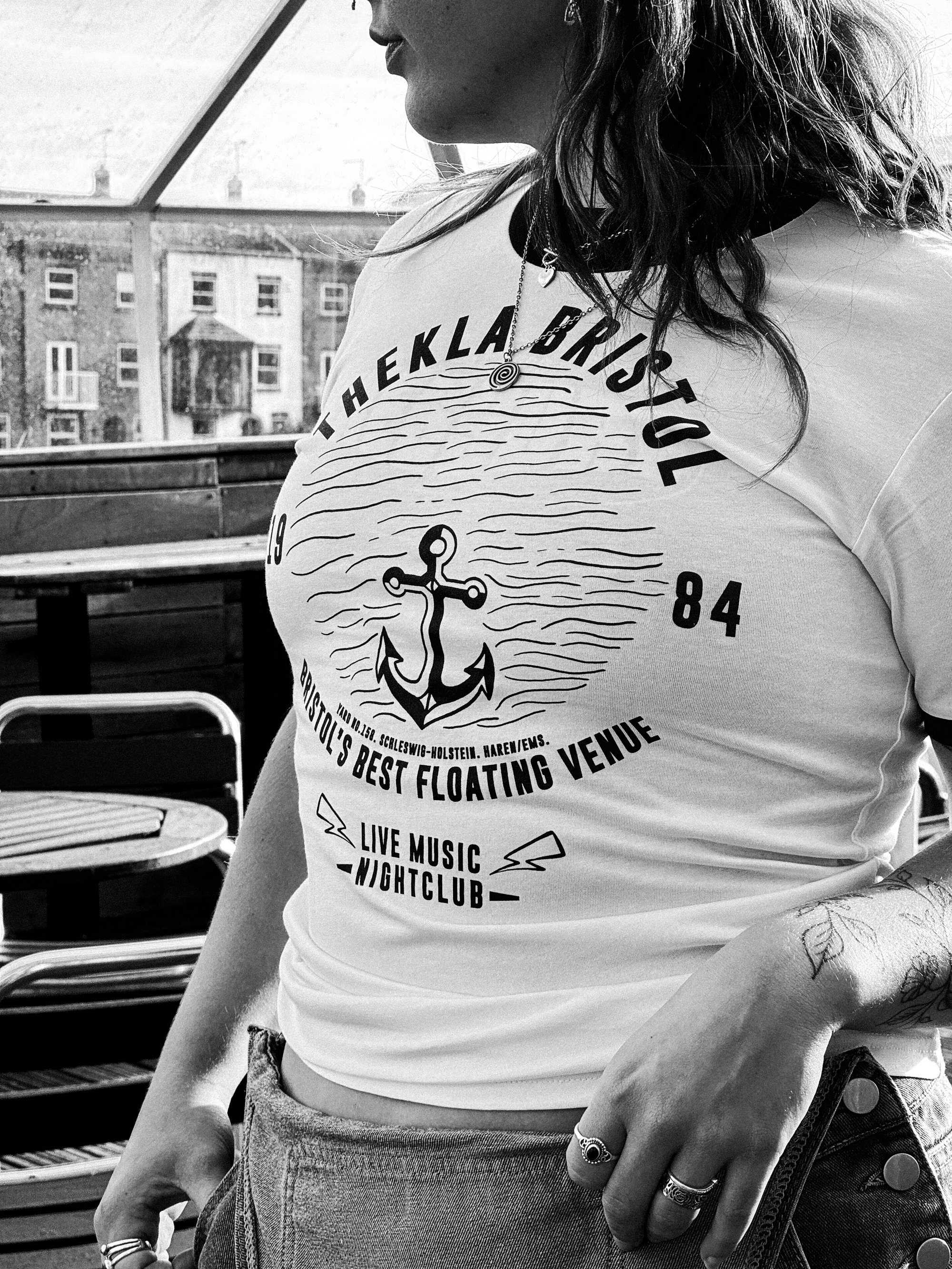 Large chest-print printed on ASColour B&W ringer tee. Printed locally in Bristol.